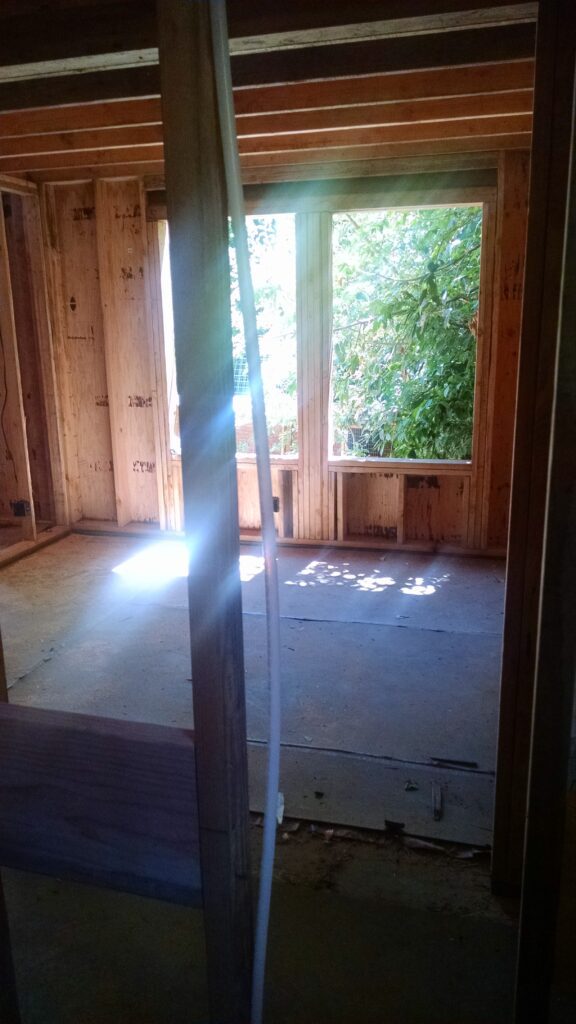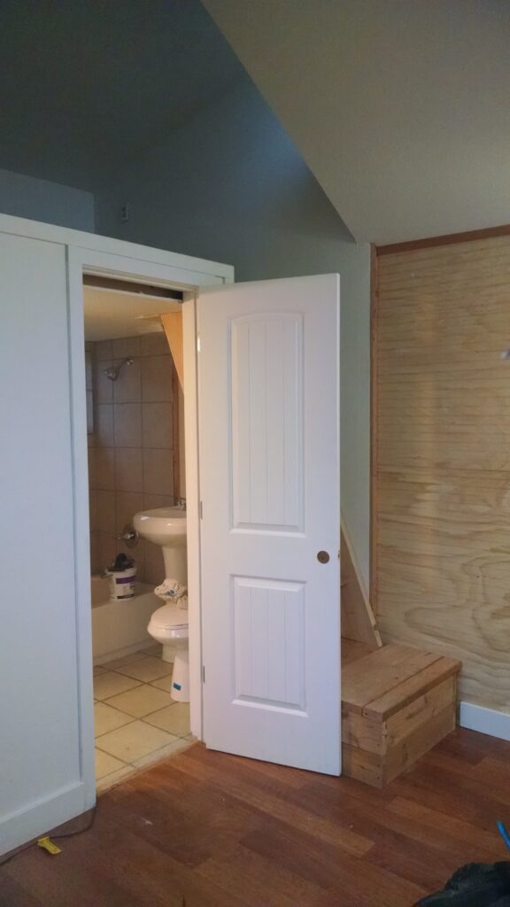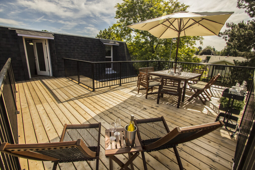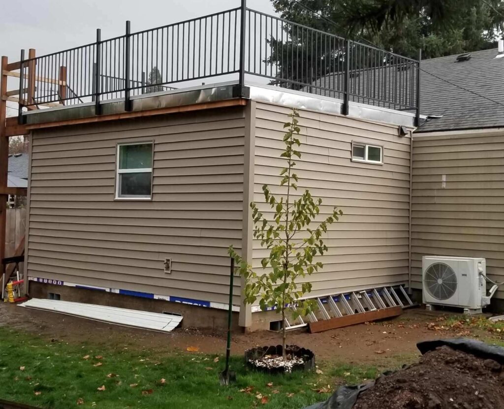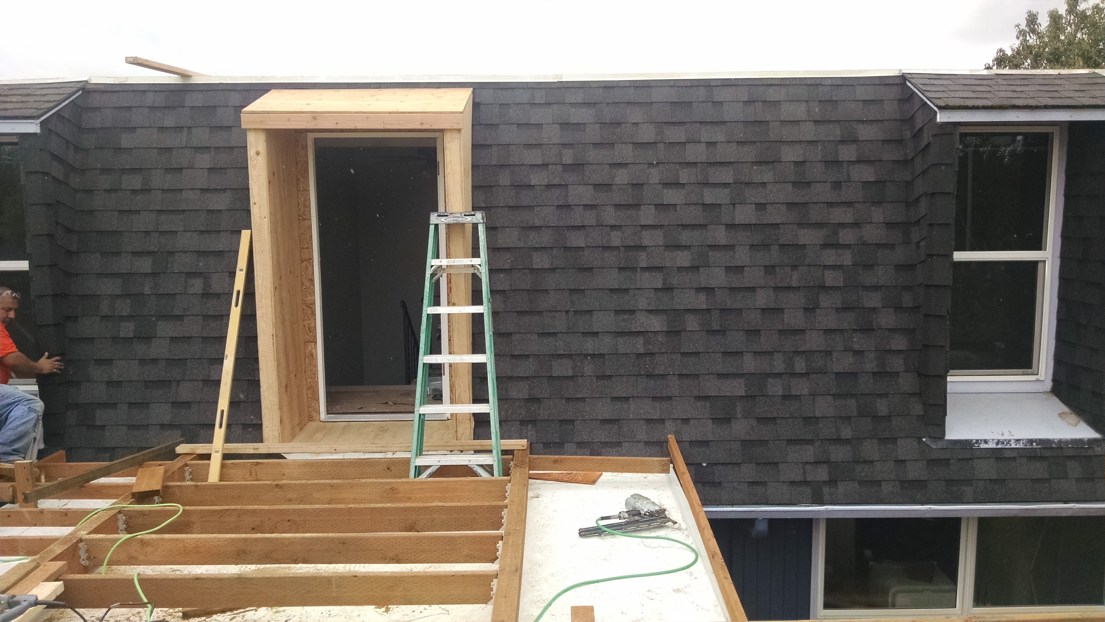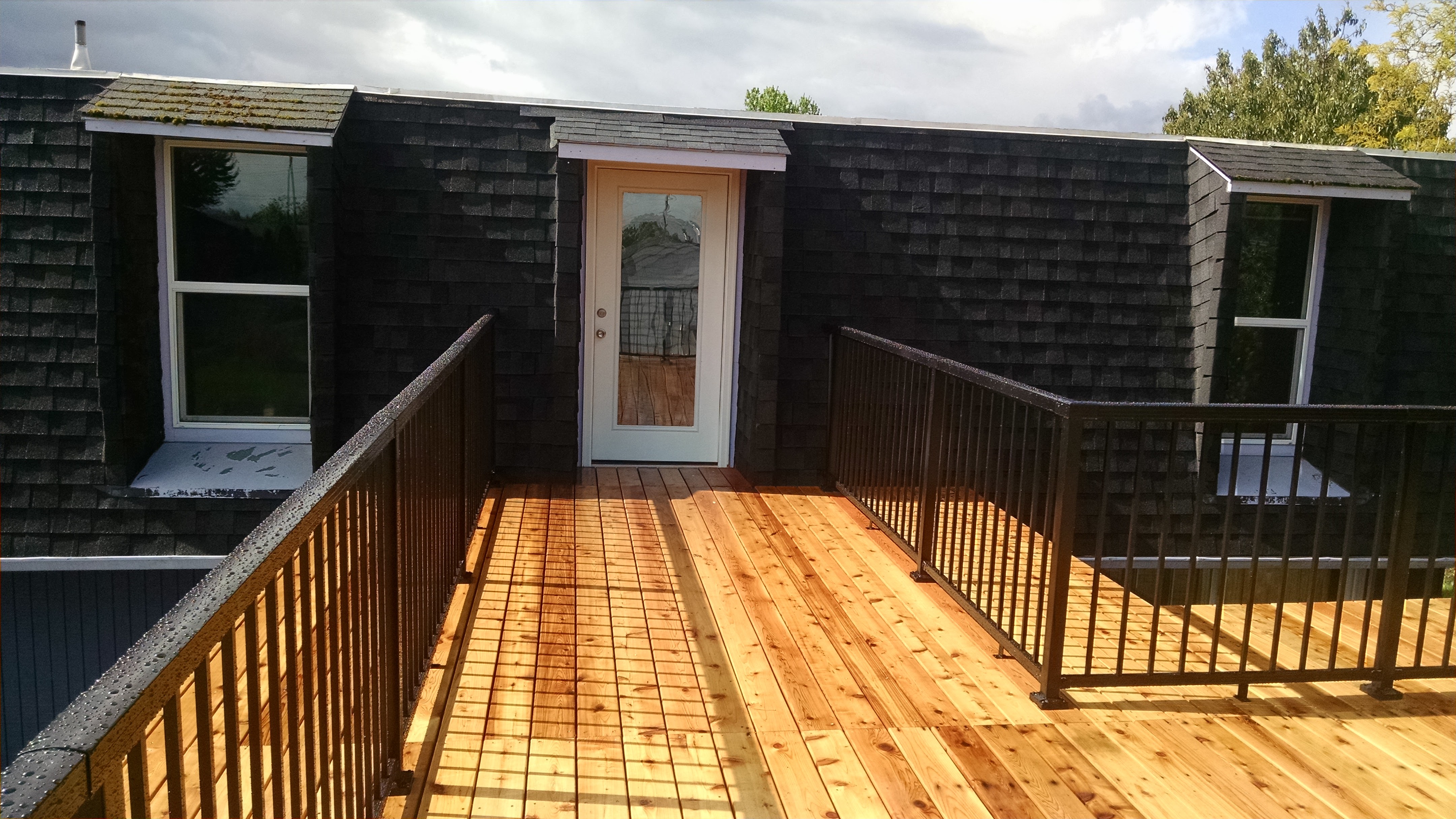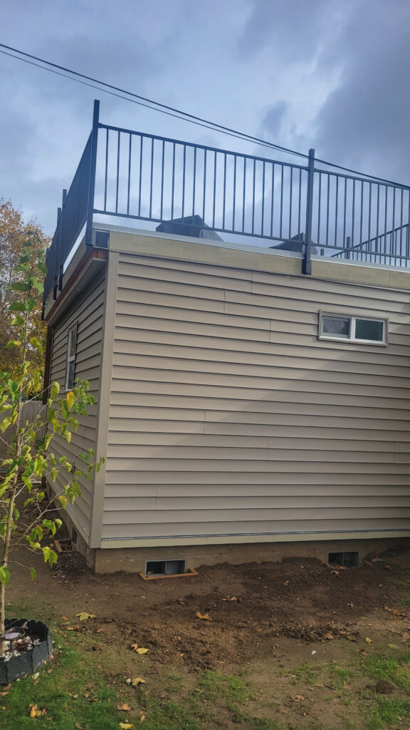 This addition was a add a bedroom and bathroom. They also chose to add a deck over their new bedroom as a roof option. They access their roof deck via an outdoor stair case. This room replaced their primary bedroom. We removed the wall from their old bedroom to expand the living room.